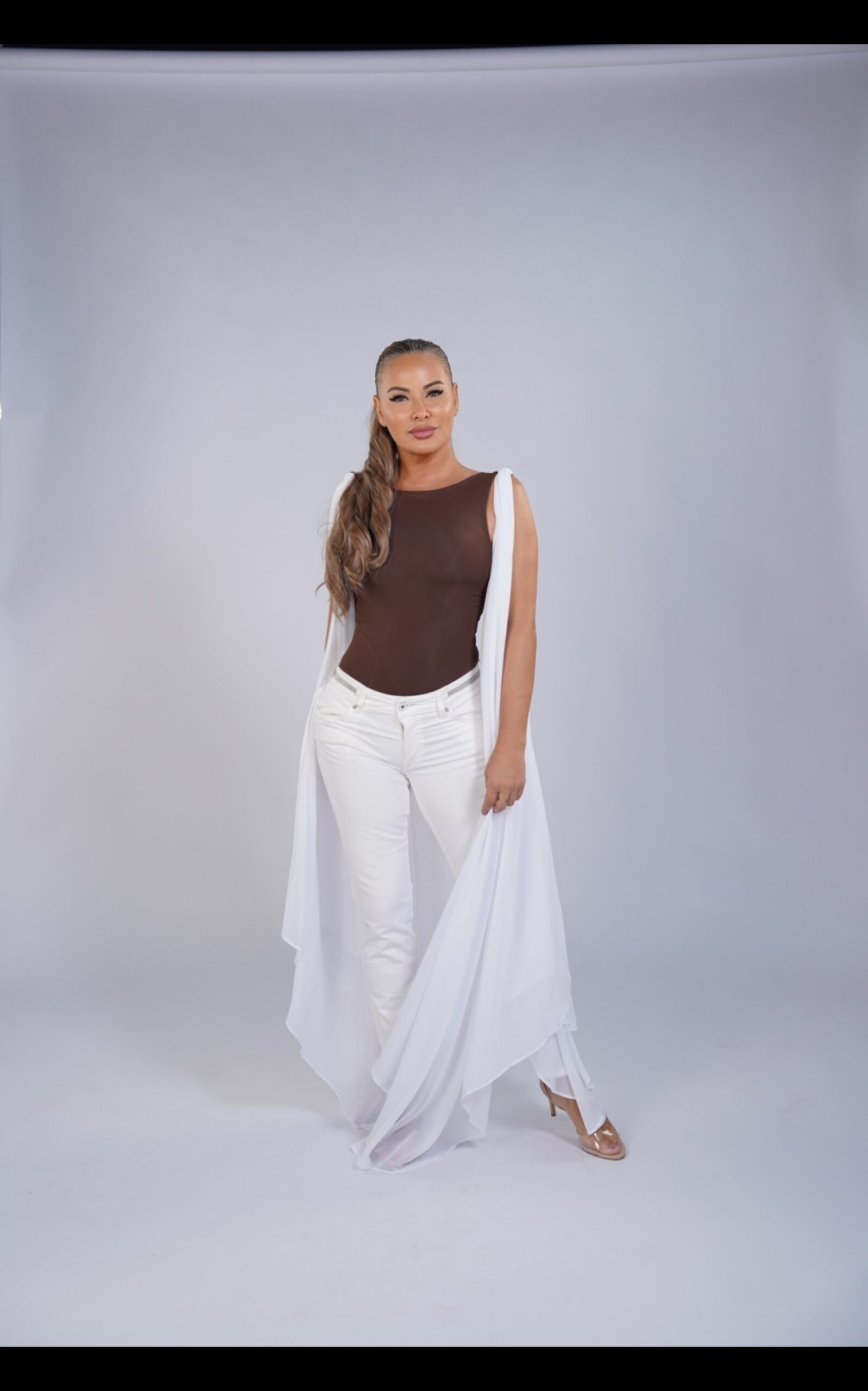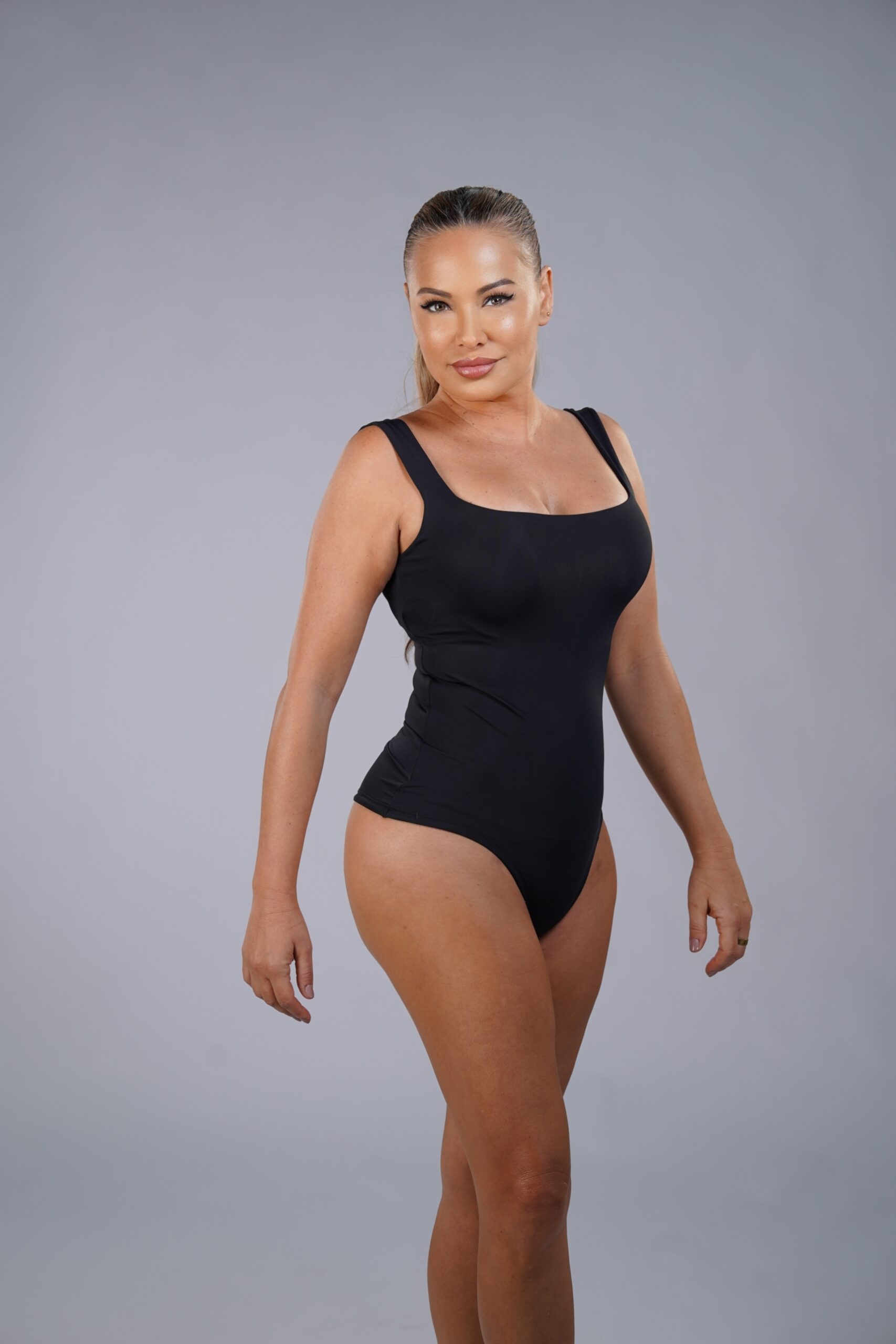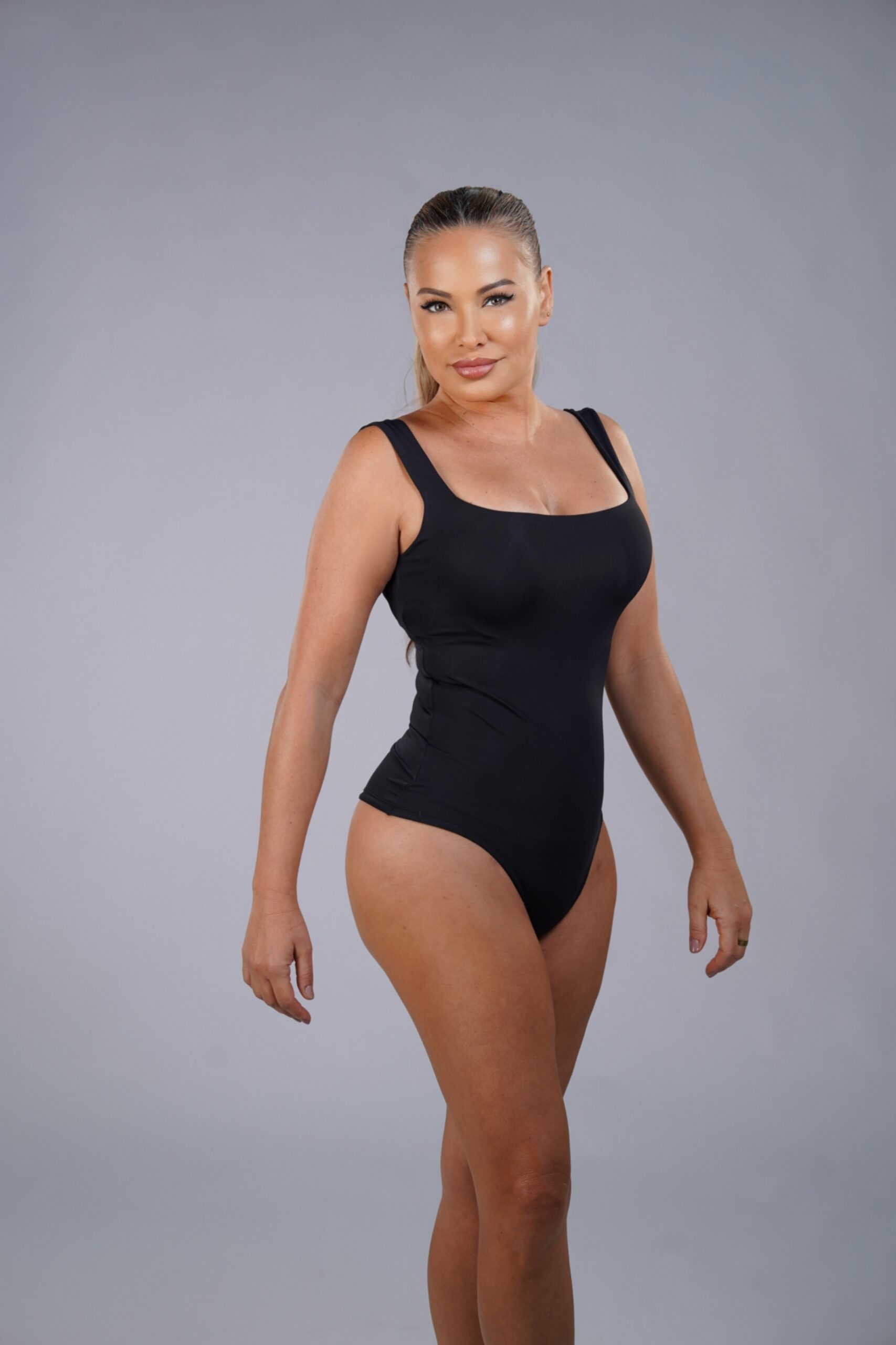 This minimalist bodysuit features a straight neckline and wide straps that create a refined, balanced silhouette. Made from premium high-compression Brazilian Lycra, it sculpts the torso and defines the waist while maintaining comfort. A versatile essential that works effortlessly from daytime chic to evening elegance.