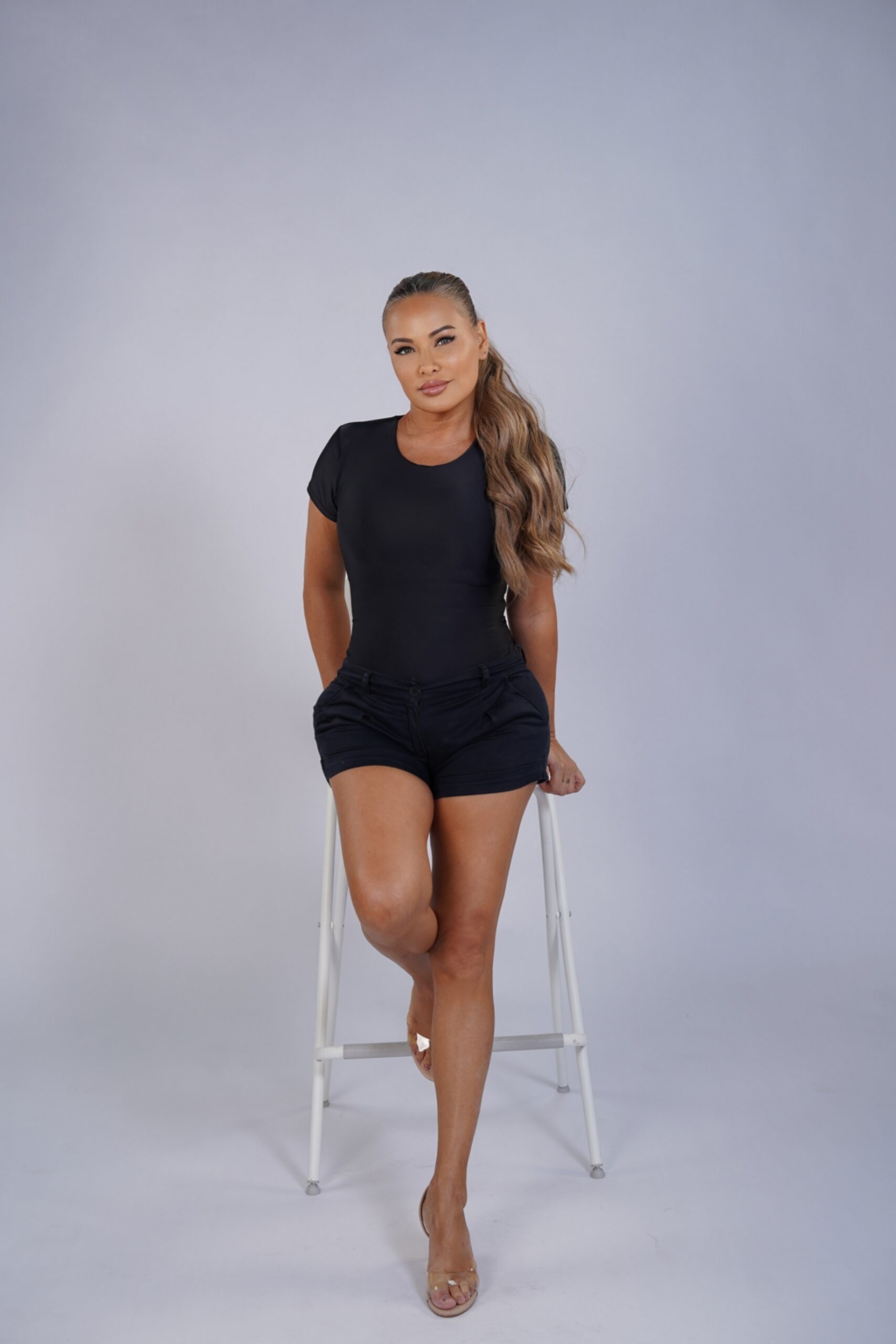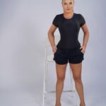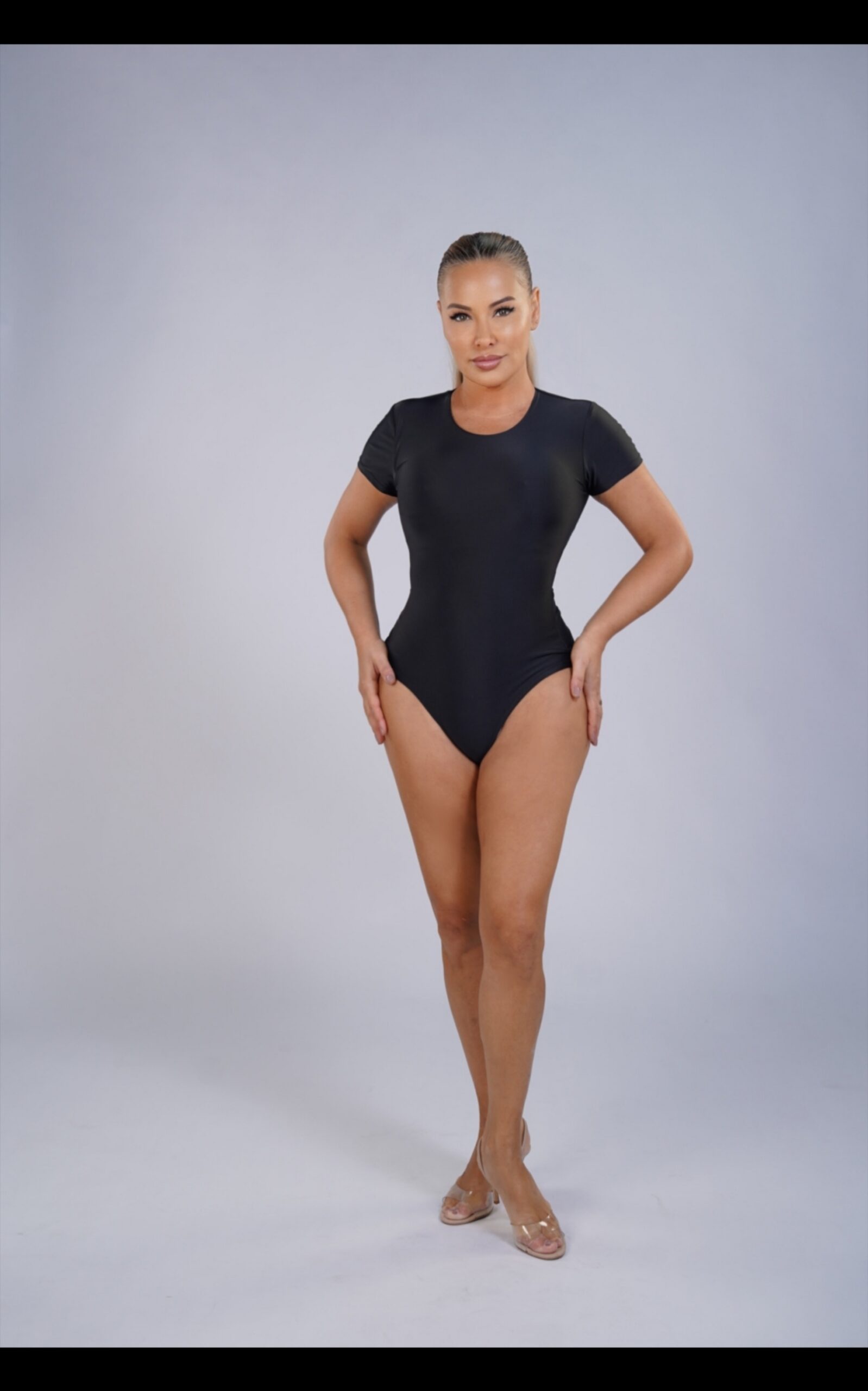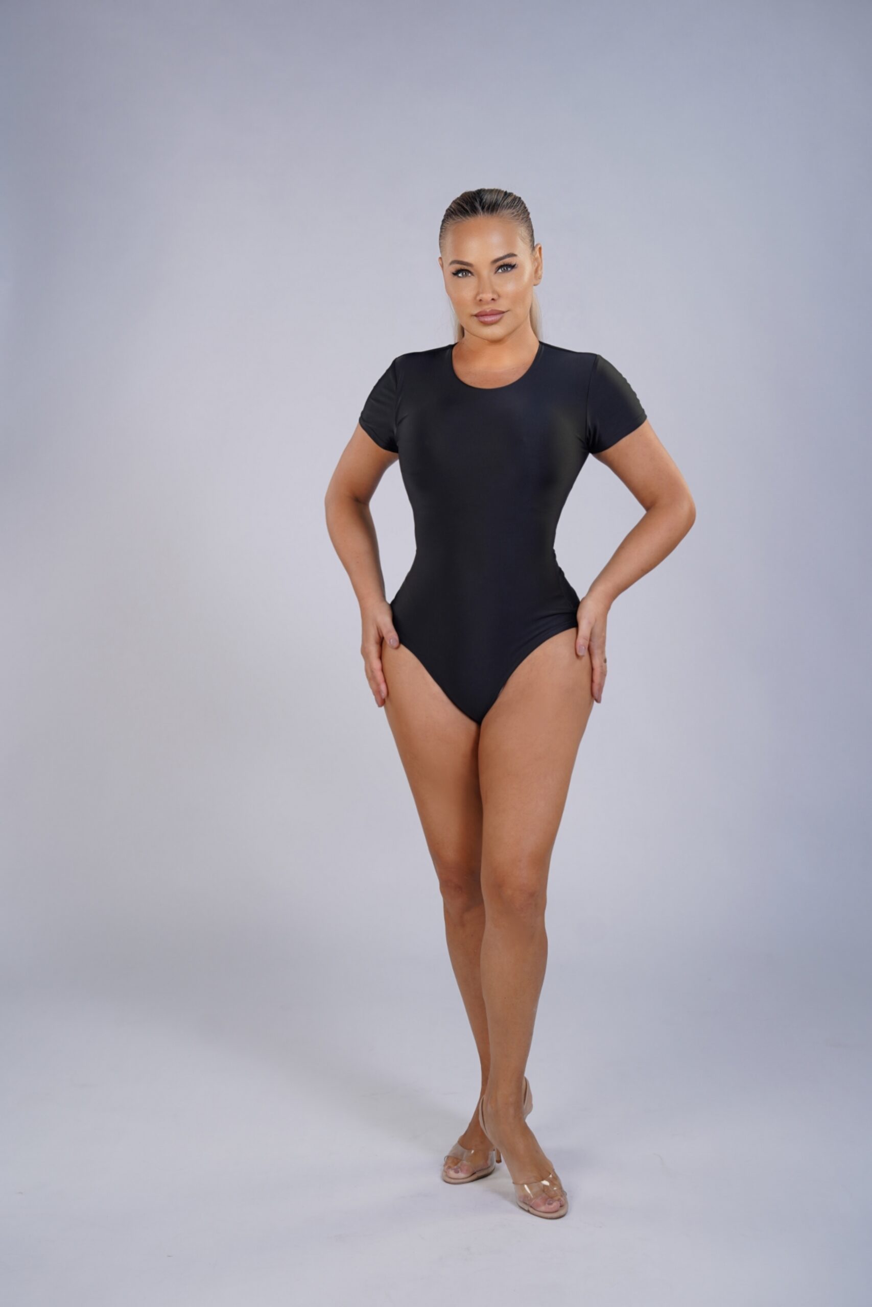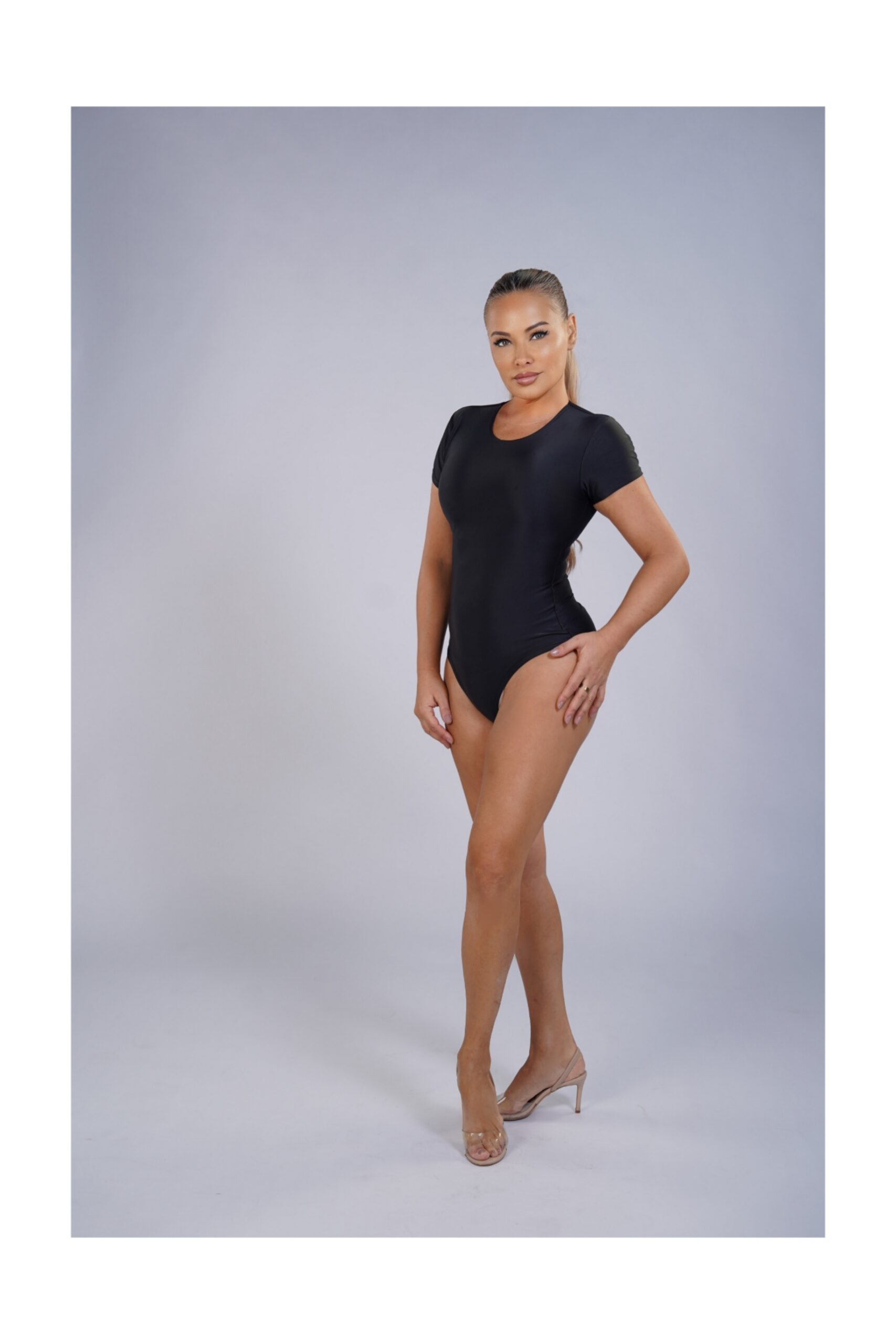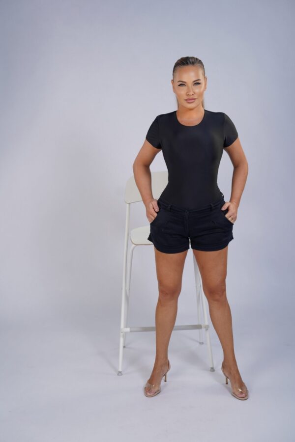 A clean, sculpting short-sleeve bodysuit designed with a minimalist neckline and a refined open-back detail. Crafted from high-compression Brazilian Lycra, it gently shapes the waist and torso while staying comfortable all day. A versatile piece that transitions effortlessly from casual looks to elevated evening styling.